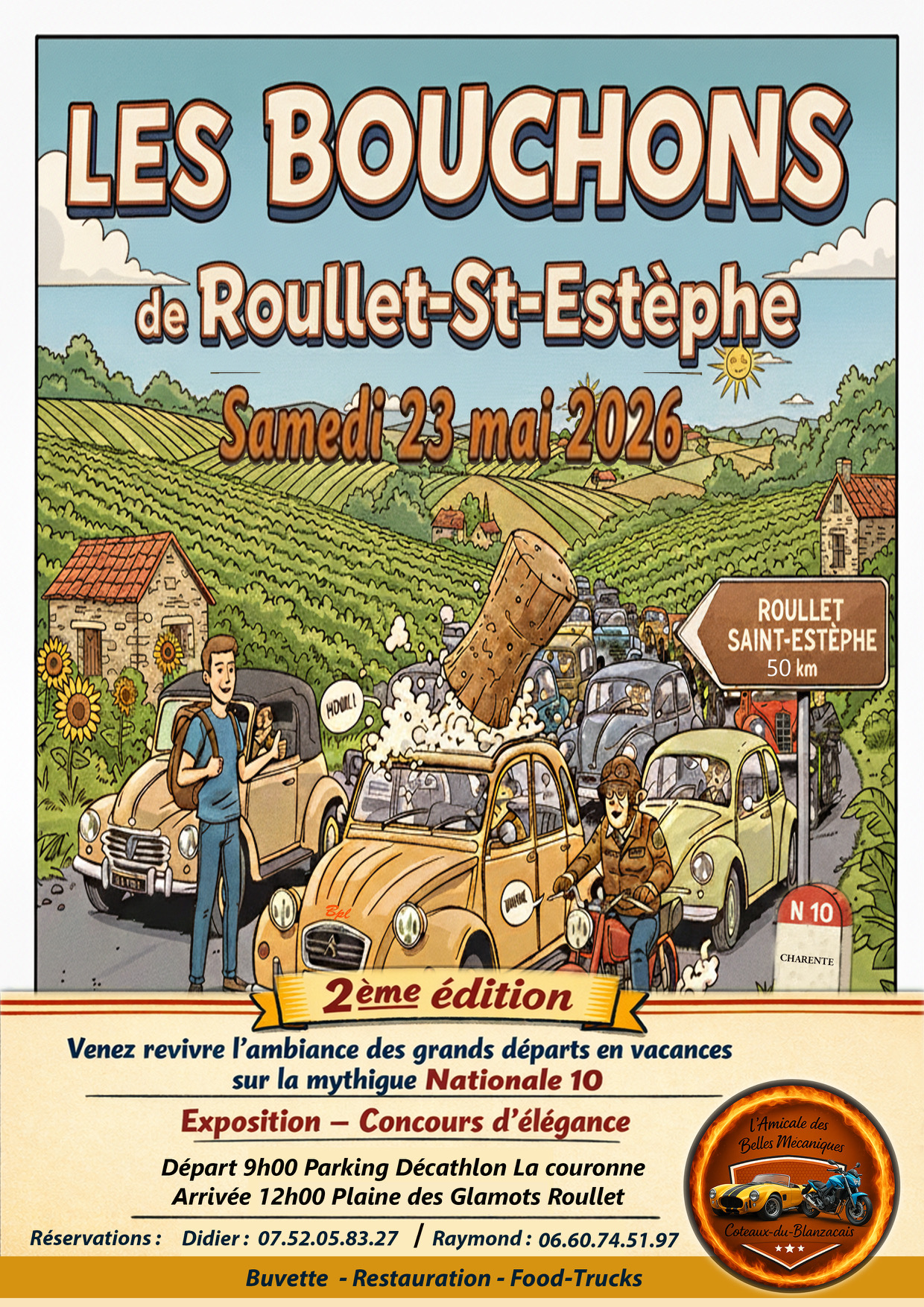 Roullet-Saint-EstèpheL'amicale des belles mécaniques organise la seconde édition des bouchons de la 10 à Roullet-Saint-Estèphe. Le rassemblement des vieilles mécaniques s'effectuera sur le parking de Décathlon pour un départ à 9h. L'arrivée se fera aux alentours de 12h sur la plaine des Glamots à Roullet. Expositions des véhicules l'après-midi. Concours d'élégance à 14h30, remise des […]